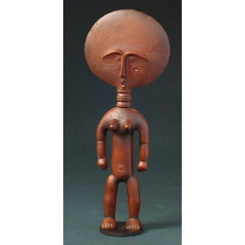 Asante African Fertility Replica Figurine from the 19th century. The Asante tribe come from Central and South Ghana on the African Subcontinent. Together with other tribes from this area, they form the Akan Peoples. The artistic tradition of the Asante has had a great influence on all decorative art from Ghana. The Asante sculptures are famous for their figurines of women, known as Akua'ba. They are usually between 8 to 16 inches in height and have a big, round flat head on a stylized body. This shape fits the ideal of feminine beauty of the Akan women: a high, flat forehead, small mouth and long neck. The Akan people attribute supernatural powers to this sacred figurine. It is said to stimulate female fertility and help conquer infertility. Women carry it with them at all times and treat it like a real child. When the figurine has proven its worth, it is added to the house altar. The small incisions in the face are meant to protect the child against the fits. The other tribes of Ghana also know their own Aku'ba. For instance, the fertility figurines of the Fante have rectangular heads and those of the Bono have triangular heads. This figurine is part of the Museum Collection of African artifact reproductions. Asante Fertility Statue is made from resin with a wood finish, bl(more...)