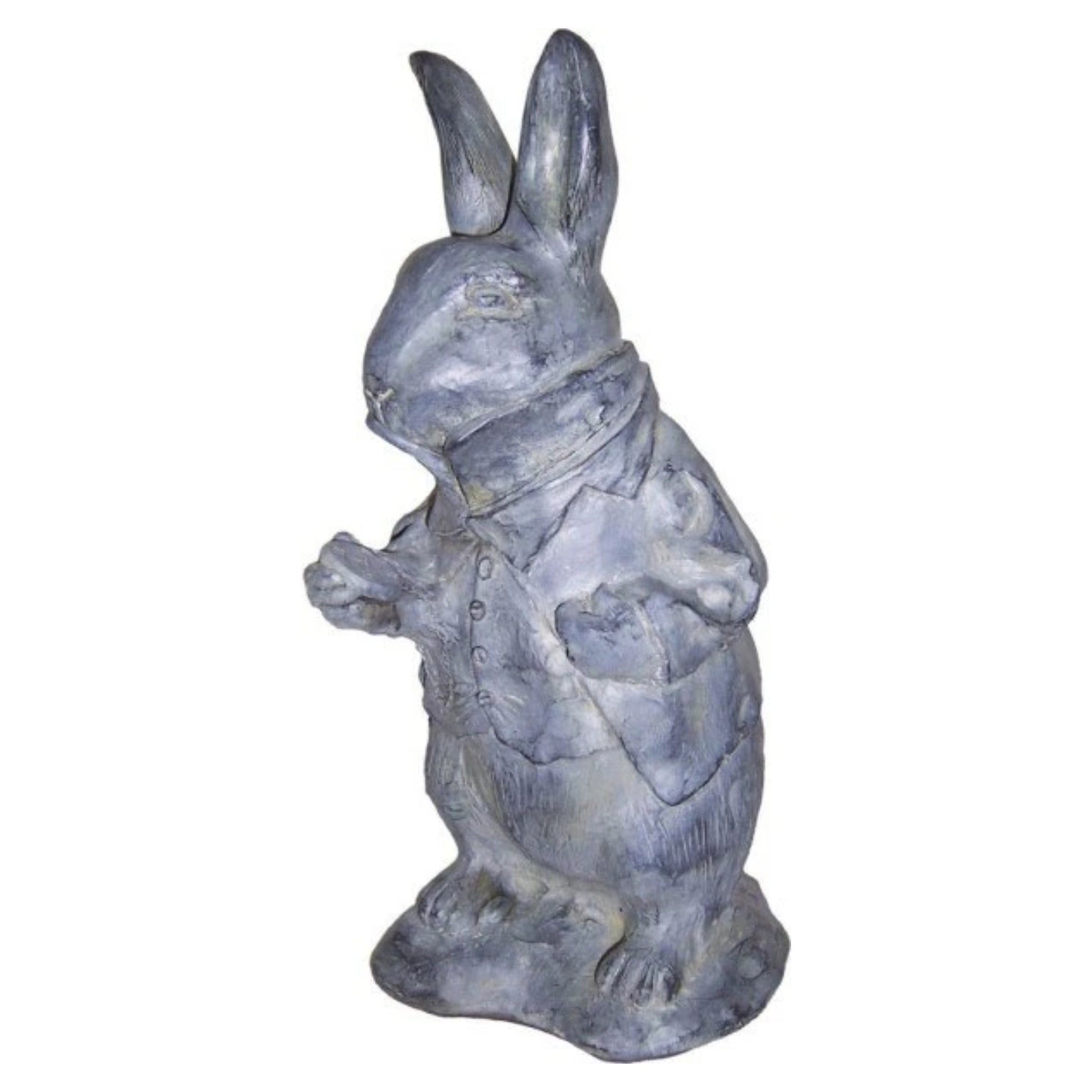 Step into the enchanting world of Wonderland with our delightful White Rabbit Garden Sculpture made of designer resin and finished in the Weathered Lead coloring. Inspired by one of the most memorable characters from Charles Lutwidge Dodgson's beloved tales, "Alice's Adventures in Wonderland" and "Through the Looking Glass," this statue brings the whimsical charm of the White Rabbit to life. Published in 1865, these stories quickly became the most popular children's tales of their time, captivating readers with their fantastical adventures and unforgettable characters.