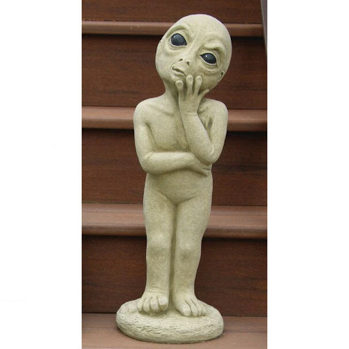 Take me to your leader! If you dream of the final frontier, our cement standing alien statue is a UFO collectibles statue sure to fuel your space age, extra-terrestrial dreams. Cast in American of quality cast stone as a classic green moss #35 alien statue shown, this close encounter with the otherworldly kind is hand-painted one paranormal visitor at a time. Get your hands on this favorite of earthlings, Science Fiction before he zooms back to Mars! Made in America. Come in a other color choices.