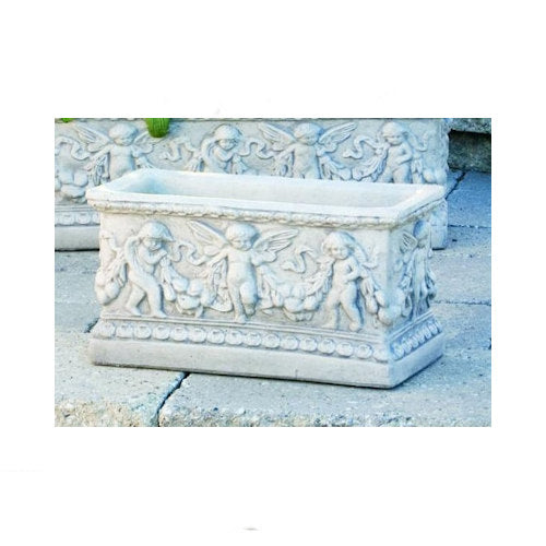 Shop our stunning Angel Box Planter rectangular cement products, skillfully crafted by Massarelli for Statue.com. Made with the finest Cast Stone material, it is designed to withstand the test of time and weather, ensuring durability and longevity. This magnificent planter offers a perfect blend of classical and traditional design that will complement any outdoor or indoor setting, from small balconies to large gardens. It comes in a versatile size of 15 inches length, 7.75 inches height and weighs a sturdy 25 pounds. The Angel Box Planter rectangular cement is an eye-catching piece that elevates the beauty of your plants and flowers, creating a breathtaking focal point to your surroundings. Its rectangular shape offers a perfect base for your plant arrangement while adding a touch of sophistication to your outdoor decorating. This premium planter is ideal for balconies, patios, front porch, and entryways, offering a stylish way to add texture and contrast to any space. Shop now and bring the beauty of the Angel Box Planter rectangular cement to your home or office.Β Also available is a matching cherub planter that 34 inches long.