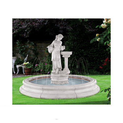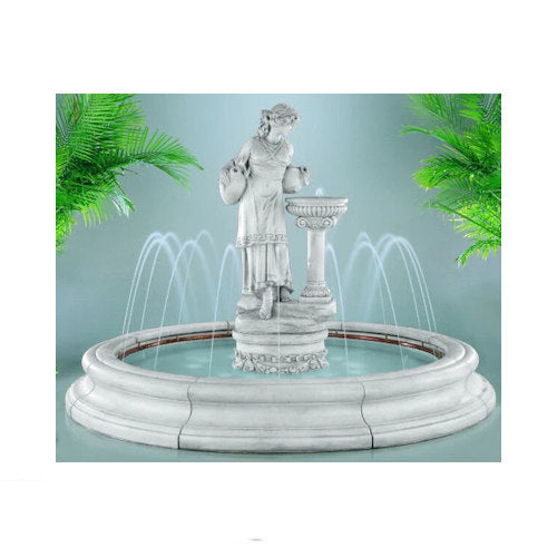 Angella pouring water from her two jugs in Toscana Pool Fountain With Spray Ring. The innate loveliness of a village beauty is captured in this exquisite fountain. The large scale sculpture portrays the innocent Angella's radiant face and slender features with delicate artistry. In this version, the Angella Fountain utilizes our extraordinary Toscana Pool, a unique hybrid ground pool that combines classic, easy-fit cast stone surround walls with a premium, one-piece fiberglass bowl. Angella's pedestal is now a pump cover, and water pours from both jugs for maximum visual and aural impact. Since the fiberglass bowls are color cast in several shades complementary to Henri finishes, this fountain is available only in a select number of finishes. Please ask about availability of finishes. Call us about HSAB874LR Four-light LED light kit with rubber stopper is available to provide an added night-time shimmering effect as an additional cost.