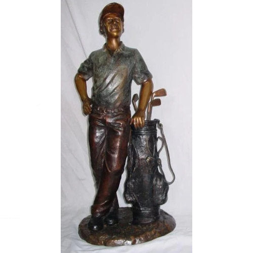 If you love to share the sport of golf, the classic golfer next to his golf bag is sure to please! Our impressive, 360-degree, almost large scale man statue is expertly finished with a hand-applied, classic bronze patina accented by and antiqued colored patinas to bring out the amazing detail. Cast and crafted one piece at a time in the traditional lost wax method, which highlights the detail of the sculpt and guarantees lasting beauty. Sure to be a garden focal point, this Statue.com, heirloom-quality bronze golf statue conveys that you take the exterior of your home as seriously as the interior.