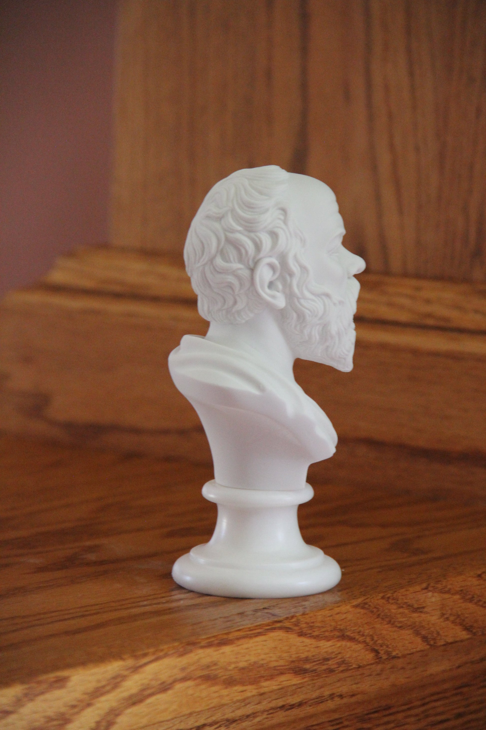 Philosopher Socrates bust made from bonded alabaster and mounted to a genuine alabaster base. The sculptor is A. Giannelli has carved the true to life features of Socrates and yet we can see his gentle soul. Socrates was born near Athens in 469 BC and was put to death in 399 BC. Initially, Socrates worked with his father as a sculptor until his pursuit of the truth through his own thinking changed everything for him and mankind. Socrates was Plato's mentor. Socrates had an early receding hairline, craggy face, blunt nose, and kind attentive piercing eyes. He wore old ragged garments and preferred to walk bare foot. Even though Socrates seemed eccentric, he was very social and caring, mixing humor with wisdom at gatherings. Socrates did not hesitate to challenge much of the thinking of the time and especially the wrong-doing in government, his challenge was mostly in the form of questions. It was his courage that caused him to be indicted on charges of corrupting the minds of the young. He refused to defend himself and was sentenced to death.