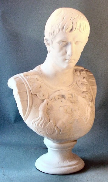 Our Augustus Caesar Bust is shown with his elaborate armor. The original bust was made from marble dating from 63 B.C - 14 A.D. was sculpted after his death. Augustus Caesar was the first Roman emperor, following the republic, which had been finally destroyed by the dictatorship of Julius Caesar, his great-uncle and adoptive father. With unlimited patience, skill, and efficiency, he overhauled every aspect of Roman life and brought durable peace and prosperity to the Greco-Roman world.