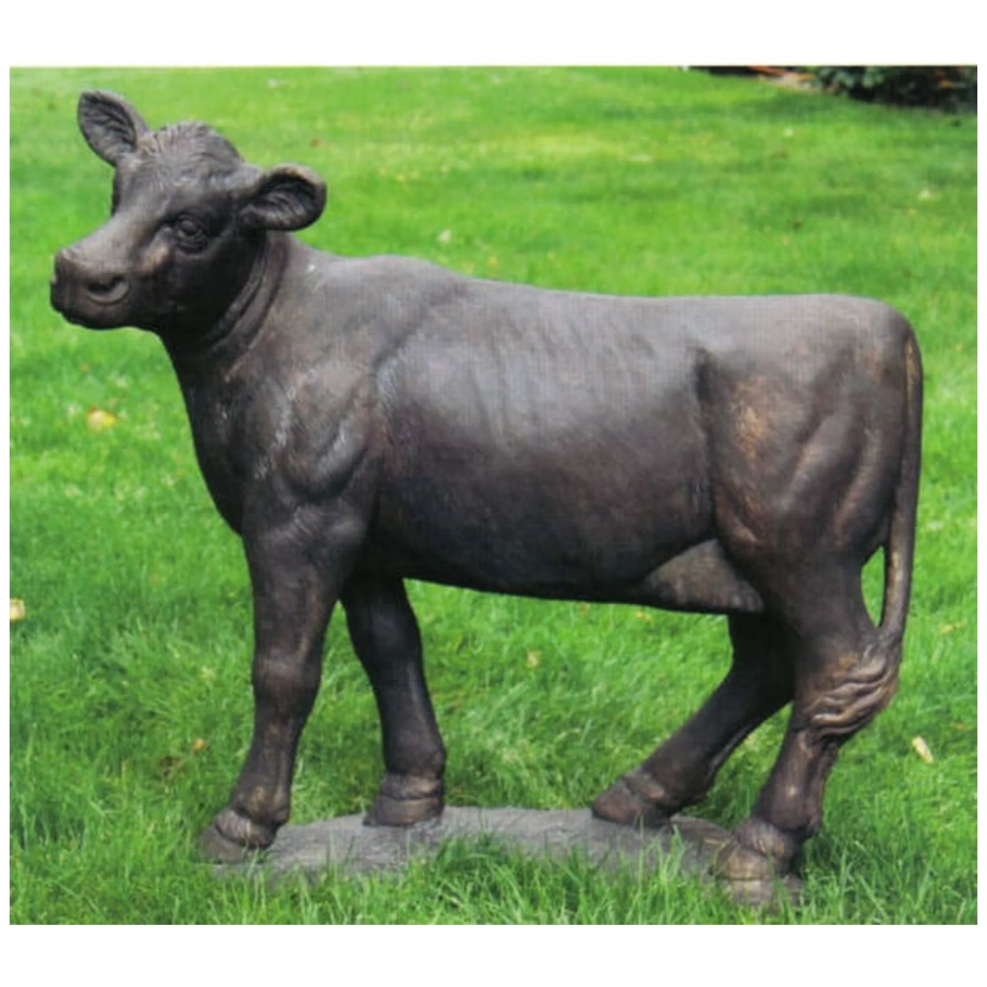 As adorable farm animal statues go, this Sculptural cow statue is "udderly" appealing! Our cow sculpture promises to bring the friendliest smile any beautiful bovine could possibly muster. At three feet long and artistically cast in quality cast stone, this lifelike cow statue is meticulously hand-painted in a color finish of your choice. This sculpture is made in the USA by American artisans. BW:12..5 x BL:28 . Shown in #98 brown Brook Mountain.
