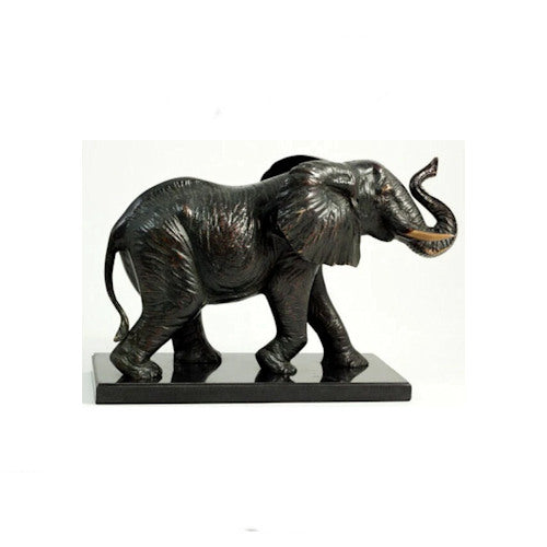 This Elephant Sculpture Brass On Wood Base statue is a study of nature's most majestic mammal and a symbol of noble wild life. A timeless elephant with trunk up sculpture, this is classic art at its finest. Our weighty high quality brass elephant sculpture is hand finish and set atop a black solid wood base. Tarnish proof.