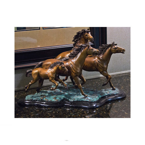 Our artistic interpretation of four wild horses, presents these exclusive, lost wax sculpture adds drama, movement and prestige to your home or that of any equine lover. As a gallery quality bronze, it is skillfully cast in the centuries-old lost wax method and mounted on a solid marble base.