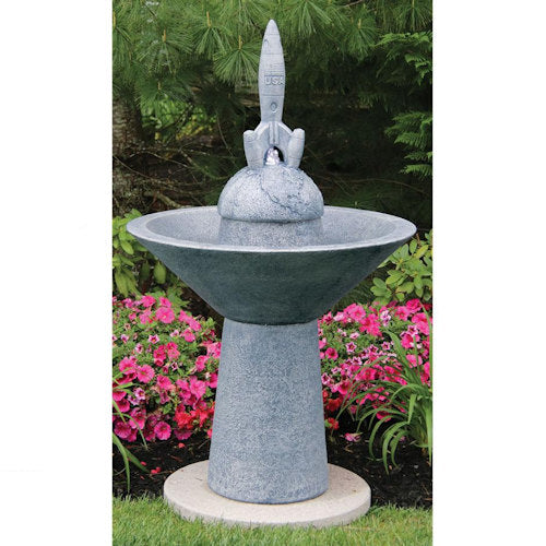 A retro unique designed garden fountain of a rocket ship, with USA inscribed with USA. This cool sleek design will be the center of your garden, made of heavy duty cast stone and comes with pump and a variety of color choices. This retro rock ship has USA on the rocket and sit on the earth and is ready to be displayed in your garden. Shown on #CMZ8211 24 inch Circular Ground Prep Circular Ground Prep Sold Separately. Made in America.
