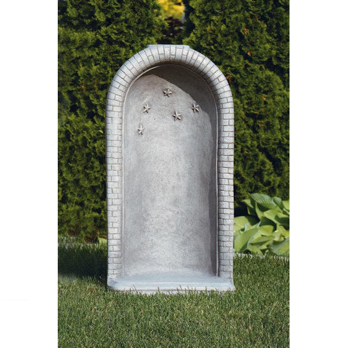 This lovely arched grotto features stars that are low-reliefs on the back of the inside wall, to create a dramatic design. This traditional grotto creates an instant alcove spot for meditation garden or for the focal point of your home garden. Sculptures sold separately. See our related item or browse our religious Jesus, Mother Mary, Saints and other religious sculpture for more ideas for this lovely grotto. Fits a 26 high sculpture or shorter. Inside size of Grotto 12 wide x10 deep.