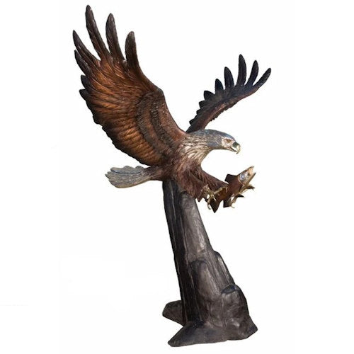 This life size bronze Bald Eagle is carrying away a fish, symbolizing its victory over an opponent. Made from high quality bronze, this item will withstand the elements for generations. Ideal for outdoor or indoor use, this sculpture is sure to make a statement.