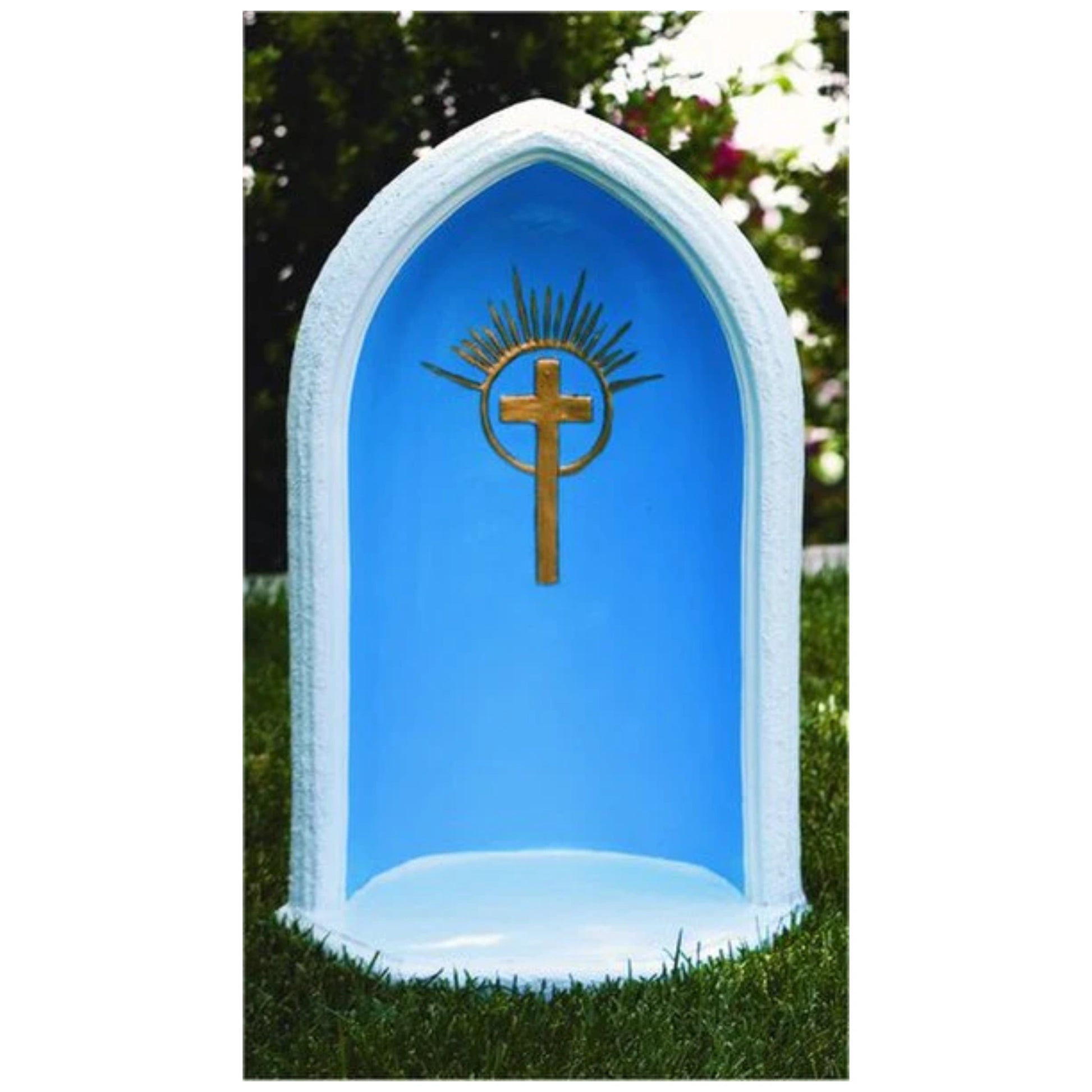 If you're looking for a unique grotto, this pointed arch with a cast. Â inlay cross may be just for you. Our grotto is hand cast of the same cast stone as Italian heirlooms passed down through the generations. This timeless grotto creates an instant, prayer spot for meditation garden or for the focal point of your home garden. Sculptures sold separately. See our related item or browse our religious Jesus, Mother Mary, Saints and other religious sculpture for more ideas for this lovely grotto. Fits an 18 inch high sculpture or shorter.