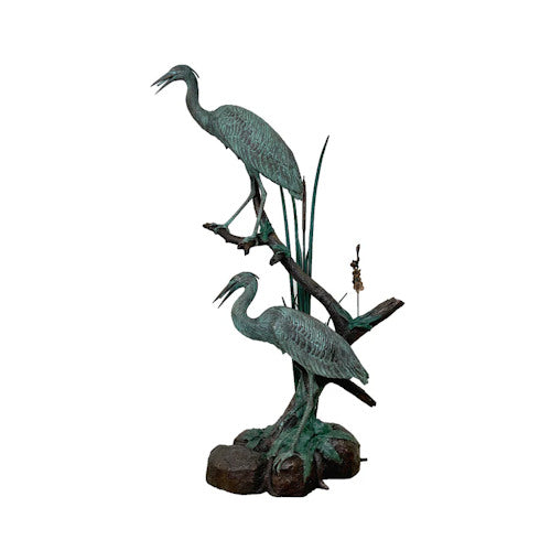 Two Crane Birds On Tree Water Feature Bronze Sculpture