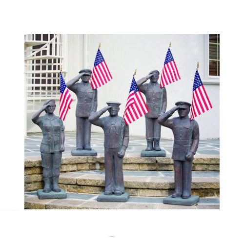 United States Armed Forces Set of five military branches. The masterful sculpted showcase the artistry of its creator to pay tribute to the United States men and woman that have served. Each statue represents the Army, Navy, Air Force, Marines and a army woman. This is a perfect gift for the patriot or the people who served in the military. All are about 42" high and American Flags included. All are made of a durable cast stone for indoor or outdoor use, and comes with an array of color choices.