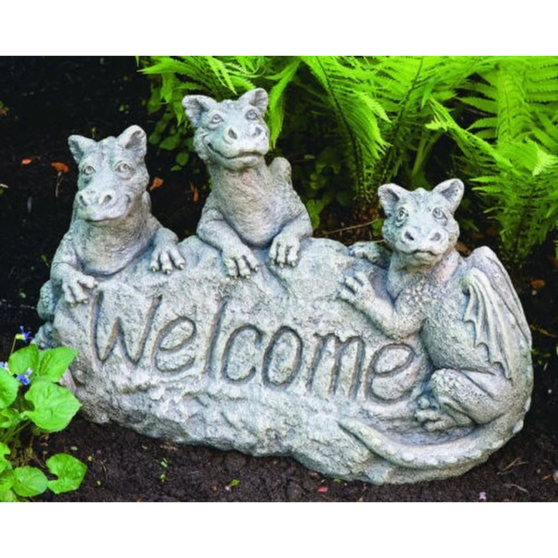Our welcome dragons statue is shown in Classic Sterling woods stone finish but when ordering you can choose the finish of your choice. Guests get a gracious Gothic welcome by this trio, when our whimsical Medieval dragons and each having big smiles welcomes all! Our Statue.com dragons sculpture is cast in quality cast stone made in the USA, these three dragons are ready to welcome all to your home or garden.