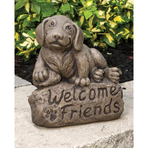 Handcrafted in the USA from durable cast stone, this statue is built to withstand the elements and bring a friendly touch to your porch, garden path, or entryway. With lifelike features and a welcoming message, it’s a perfect gift for dog lovers or anyone who appreciates classic garden accents.