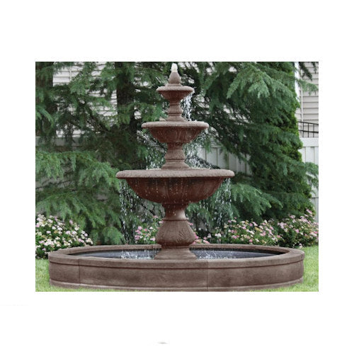Our grand scale Windley Key Fountain with surround and eight foot fiberglass pool is a elegant display for the entryway of your home or the garden setting. Distinctive statuary always adds a stately ambience, but never more so than with this classical estate sized fountain. Made of durable cast stone in a color of your refine taste. Just imagine this cascading fountain as a breathtaking focal point, come with pump and instruction to set up this timeless fountain.